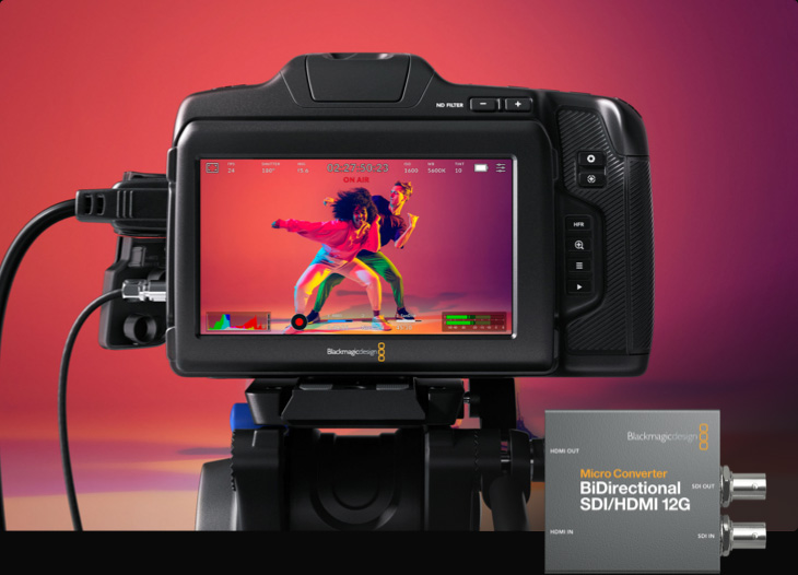 Blackmagic Pocket Cinema CameraなどのHDMIカメラに接続するには、Micro Converter BiDirectional SDI/HDMIを使用します。このコンバーターは、カメラのHDMIをスイッチャーのSDI入力に変換します。また、スイッチャーのSDI出力にカメラコントロールの情報をエンベッドし、カメラへのHDMIデータリンクで送信することも可能。これにより、レンズの完全なカメラコントロールが得られます。また、カラーコレクターも内蔵しており、ライブタリーにも対応しています!