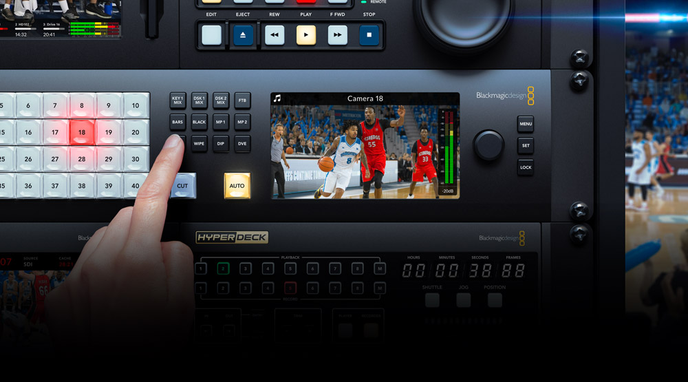 パワフルな1 M/Eライブプロダクションスイッチャー。フォーマット変換機能に対応した10個の3G-SDI入力、6個の3G-SDI出力、DVE、4つのクロマキーヤー、16通りのマルチビュー、メディアプレーヤー、トークバック、USBウェブカム出力を搭載。