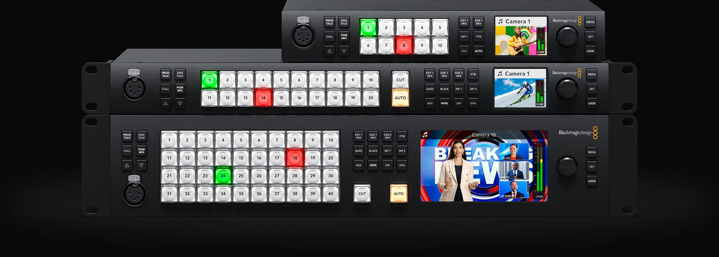パワフルな1 M/Eライブプロダクションスイッチャー。フォーマット変換機能に対応した10個の12G-SDI入力、6個の12G-SDI出力、DVE、4つのクロマキーヤー、16通りのマルチビュー、メディアプレーヤー、トークバック、USBウェブカム出力を搭載。