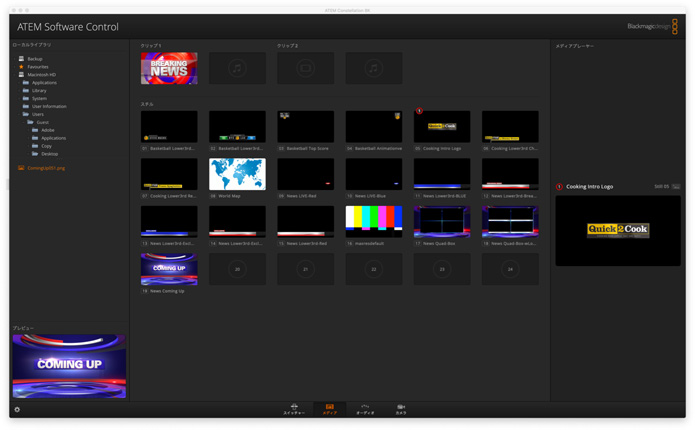 内蔵メディアプールは放送品質のRGBAグラフィックおよびアニメーションを保存でき、2つまたは4つのメディアプレーヤーから瞬時に再生可能。ATEM Constellationでは、メディアプレーヤーは追加の入力ソースとして表示されます。グラフィック用に外部のSDI入力を使用する必要はありません。内蔵のメディアプールはメディアプレーヤーで使用するグラフィックを保存でき、1 M/Eモデルでは20個のスチルと200フレームのアニメーション、2 M/Eモデルでは40個のスチルと400フレームのアニメーション、4 M/Eシリーズでは60個のスチルと400フレームのアニメーションを保存可能。スチルストアのグラフィックは、同梱のATEM Software Controlアプリで簡単に管理できます。ATEM Photoshopプラグインを使って、Photoshopソフトウェアから直接ダウンロードすることもできます。