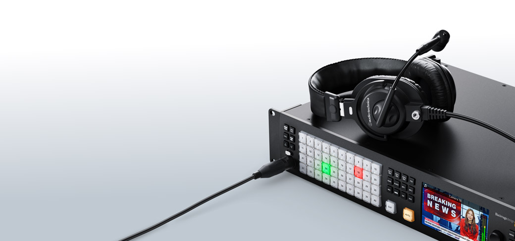 スタッフが一丸となって作業できるよう、ATEM Constellationはトークバック機能を内蔵しています。トークバック用には、5ピンXLRヘッドセットコネクターをサポートしており、リアパネルのRJ12コネクターを使用して、ClearComやRTSなどの業界標準のトークバックシステムに接続可能。プログラム/エンジニア用ループ、ヘッドセットマイク用のサイドトーンコントロール、プログラムミックスなど、トークバックを完全にコントロールできます。ATEM ConstellationはSDIチャンネル15と16を使用したSDIトークバックもサポート。Blackmagicカメラと双方向通信が可能です。チャンネル13と14はエンジニア用トークバックに使用できます。トークバックマイクをプログラムオーディオにミックスして、ボイスオーバーとして使用することも可能です!
