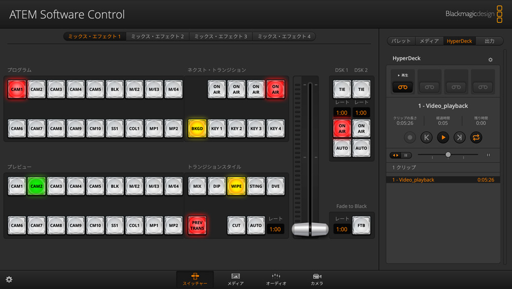今すぐ購入ATEM Software Controlは、スピードと正確性を重視して設計されたインターフェースを搭載しています。ページが分かれているので、コントロール、オーディオ、マクロ、メディア、デッキコントロールなど、スイッチャーの主要な機能のコントロールを簡単に見つけられます。スイッチャーページは、ソースボタン、トランジション、キーヤーなどが馴染みのあるレイアウトで配置されています。さらに、スイッチャーページのパレットでは、トランジション、キー、メディアプレーヤーの調整が可能です。メディアページではすべてのグラフィックファイルの管理やスイッチャーへのアップロードが可能で、オーディオページでは内蔵のマルチチャンネルFairlightオーディオミキサーをコントロールできます。