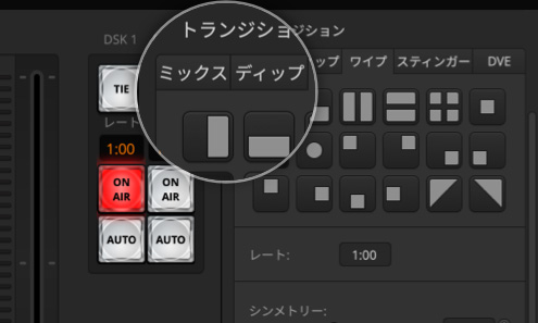 トランジションの長さをカスタマイズしてAUTOボタンを押すと、完璧なタイミングのスムーズなトランジションを実行できます。AUTOボタンがオンの場合、ソース間の切り替えにはトランジションが自動的に追加されます。AUTOボタンでは、ミックス、ディップ、ワイプ、DVEなどを実行できます。プログラム/プレビューの切り替えに設定すると、AUTOボタンの機能はトランジションのトリガーに変更されます。