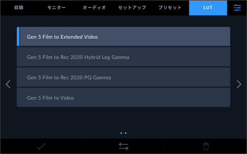 LUTでは、撮影中に特定の”ルック”をイメージに表示できます。使用中は、LCDの左上にLUTアイコンが表示されます。収録クリップにLUTをエンベッドしている場合は、このアイコンは青に変わります。