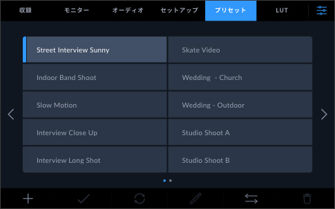 Blackmagic Studio Cameraのタッチスクリーンメニューは、6つのタブから構成され、エレガントで分かりやすいインターフェースになっています。つまり、カメラのすべての設定と機能へのすばやいアクセスや完全なコントロールが可能!収録、モニター、オーディオ、セットアップ、プリセット、LUTのタブをタップするだけで、カメラのあらゆる機能の設定にアクセスできます。独自のインターフェースデザインは、Blackmagic Studio Cameraとその他のBlackmagicカメラで視覚的に統一されているので、新しいカメラの操作を覚える時間がない場合に非常に便利です!すでに操作を取得しているカメラと同様に機能するので、Blackmagic Studio Cameraの操作を一から学ぶ必要はありません。