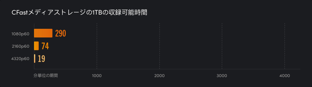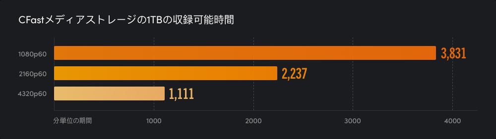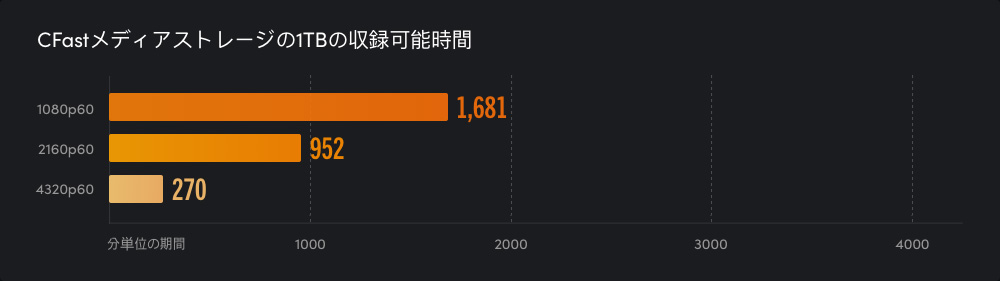CFastに対応しているため、手に入りやすいフラッシュメモリーカードに収録が可能。H.265ファイルは小さいので、標準的なCFastカードに長時間収録できます。CFastカードのスロットを2つ搭載しているため、収録中でもフルになったカードを交換でき、半永久的な収録が可能。CFastカードは、小型、高速、低価格なので、放送に最適です。また、Blackmagic MultiDock 10Gを追加するとSSDも使用できるようになります!H.265では、1TBのカードに8Kp60を1,398分、2160p60のUltra HDを3,530分、1080p59.94を9,446分まで収録できます。つまり、8Kで23時間以上、HDで6日間以上の収録が可能。