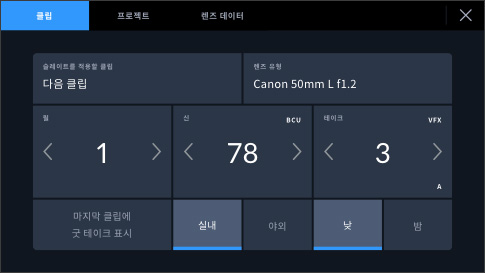 URSA Cine는 가장 빠르게 메타데이터를 숏에 추가할 수 있는 디지털 슬레이트 기능과 뛰어난 메타데이터 기능을 지원합니다. 화면을 좌/우로 쓸어 넘기면 디지털 슬레이트가 나타납니다. 게다가 녹화 시작 및 정지 시에 URSA Cine에서 테이크 번호가 자동으로 증가되기 때문에 촬영 숏에 번호를 직접 입력할 필요가 없습니다. 또한 카드를 포맷할 때마다 릴 번호가 자동으로 증가하도록 설정할 수도 있습니다. 이뿐만 아니라 전자식 렌즈의 메타데이터를 자동으로 읽어 오거나 수동으로 입력할 수 있으며, 프로덕션 관련 정보 및 기술 정보 등을 입력할 수도 있습니다. 모든 메타데이터는 파일로 저장되어 후반 제작 시 DaVinci Resolve와 같은 편집 및 색보정 소프트웨어에서 사용할 수 있습니다.