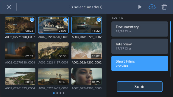 En caso de no contar una con conexión a Internet, es posible buscar archivos y seleccionar aquellos que se quieran subir a la plataforma Blackmagic Cloud más adelante, cuando sea posible acceder a ella.