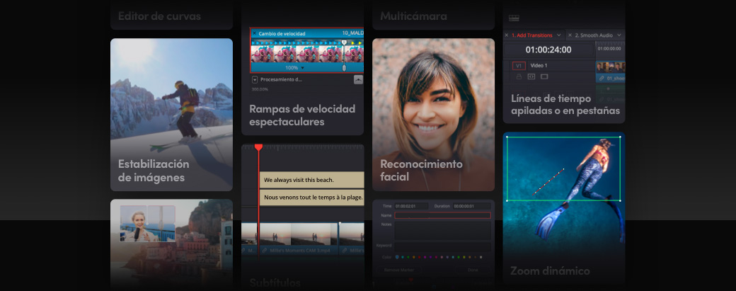 Una vez dominados los conceptos básicos, el módulo Edición ofrece una amplia variedad de prestaciones que brindan un control absoluto sobre todos los aspectos creativos de tu trabajo. Por ejemplo, brinda la posibilidad de crear la banda sonora final, añadir rampas de velocidad, utilizar herramientas de edición y recorte avanzadas para procesar proyectos más sofisticados, transcribir clips a fin de generar subtítulos o editar según el texto, usar la función de reconocimiento facial a efectos de organizar clips según distintos personajes y procesar el material grabado con varias cámaras. Además, DaVinci Resolve es compatible prácticamente con todos los formatos de archivos audiovisuales proporciona distintas maneras de ordenar clips, lo cual es particularmente útil en proyectos de mayor complejidad.