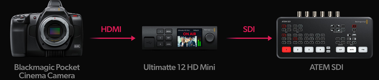 El modelo Ultimatte 12 HD Mini cuenta con una función especial capaz de convertir las señales SDI de control de la cámara a formato HDMI. De esta forma, un mezclador ATEM SDI puede controlar una unidad Blackmagic Pocket Cinema Camera conectada al puerto HDMI. Este modelo permite transmitir dicha señal de control del mezclador a la cámara. Para ello, basta con conectar la salida SDI de una unidad Ultimatte a la entrada correspondiente en el mezclador, la salida principal de este a la entrada del compositor, y finalmente la entrada HDMI de este último a la cámara. Posteriormente, al asignar un número a la cámara mediante el programa utilitario, es posible ajustar el color, activar la luz piloto y comenzar la grabación de manera remota. Además, es posible controlar la cámara desde mezcladores ATEM Mini.