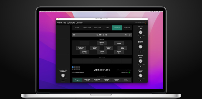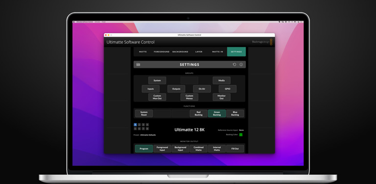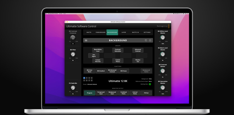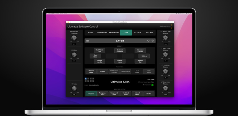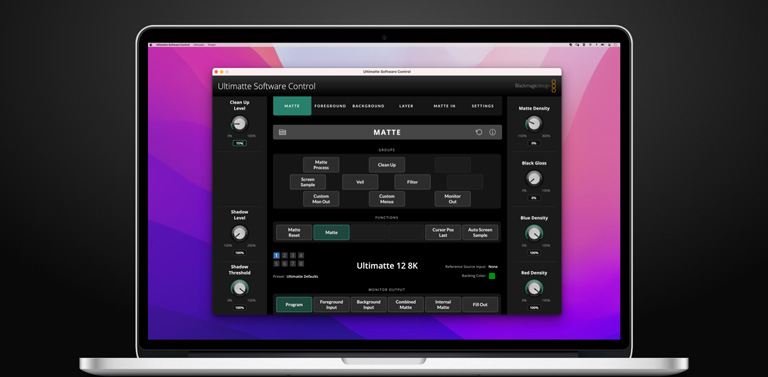 Todos los modelos Ultimatte 12 incluyen el programa Ultimatte Software Control para Mac y Windows. Su ventana principal presenta distintas secciones con menús para diferentes funciones. A pesar de que la interfaz puede resultar abrumadora al principio dada la gran cantidad de botones y ajustes, es posible aprender a alternar entre ellos con rapidez a medida que se crea la composición. El programa utilitario también permite cargar contenidos en la memoria interna del dispositivo desde equipos informáticos. Todos los ajustes y las imágenes fijas estarán disponibles incluso después de apagar la unidad. A su vez, los modelos Ultimatte 12 4K y 8K incluyen conexiones Ethernet 10G para transferir datos más rápido.