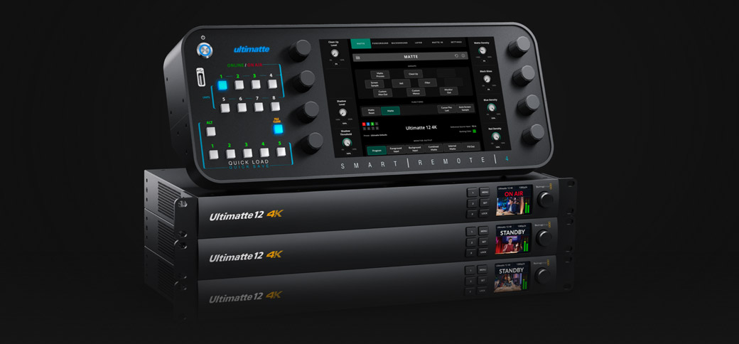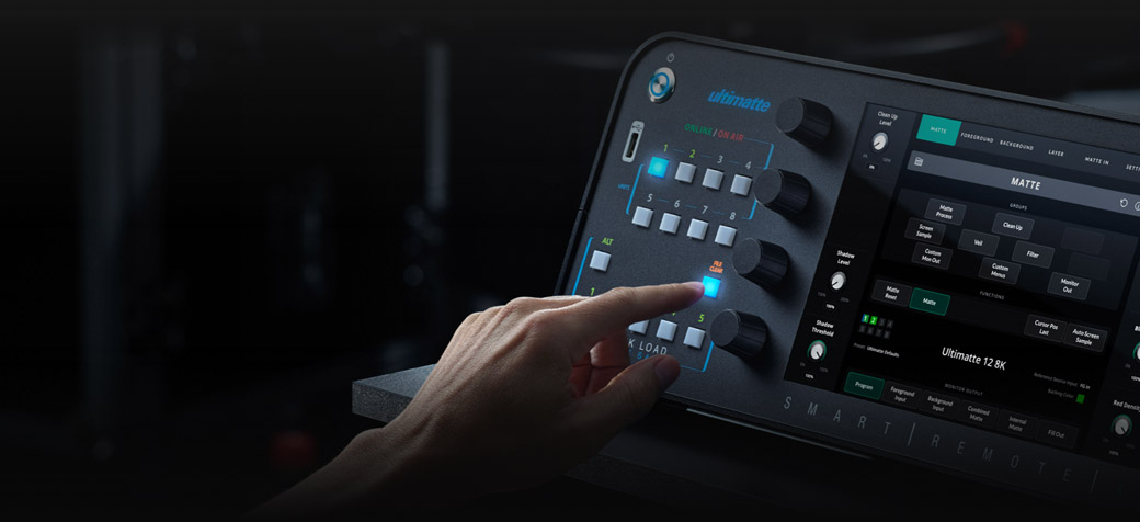 Este dispositivo es un control con pantalla táctil que permite manejar unidades Ultimatte 12 a través de una red Ethernet. Junto con la función de monitorización, es posible ver la señal de hasta ocho unidades sin una matriz de conmutación adicional. Asimismo, el panel cuenta con botones físicos y mandos giratorios para aplicar ajustes predeterminados y guardarlos, mientras que la pantalla táctil ofrece fácil acceso a cada uno de los parámetros. A su vez, los botones del panel frontal de las unidades Ultimatte permiten recuperar ajustes predeterminados, y también es posible crear soluciones individuales fácilmente mediante el protocolo de control basado en texto.