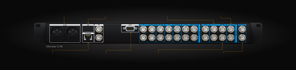 Los modelos Ultimatte 12 4K y 8K incluyen conexiones SDI 12G compatibles con formatos HD actuales y estándares UHD o 8K de última generación. Solo esta conectividad permite procesar imágenes en UHD mediante un solo conector BNC, que también puede emplearse con equipos HD. Así, estos modelos admiten prácticamente cualquier equipo SD, HD y SDI 3G, 6G o 12G, así como todos los formatos HD y UHD a una resolución máxima de 2160p60. Por su parte, el modelo Ultimatte 12 8K ofrece conexiones SDI 12G de cuatro enlaces compatibles con señales 4320p60. Esto permite utilizarlo con cámaras HD en la actualidad y, a su vez, estar preparado para procesar contenidos UHD u 8K cuando sea necesario.