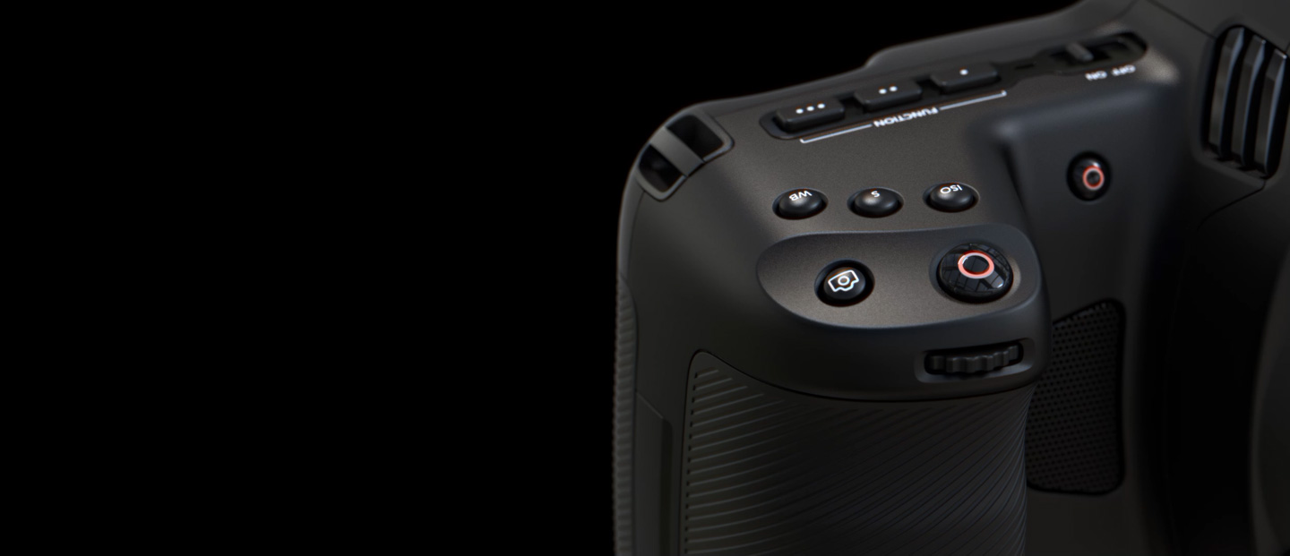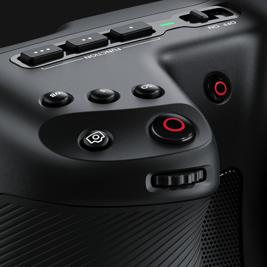The front and top of the Blackmagic Cinema Camera 6K features record start/stop and still photo buttons along with dedicated controls for iris, ISO, white balance and shutter speed. The main power switch is located on the top next to a row of 3 customizable function buttons.