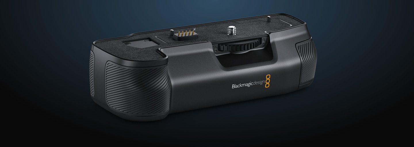 Blackmagic Pocket Camera Battery Pro Grip adds two extra NP-F570 batteries to the Cinema Camera 6K for over 3 hours of shooting on a single charge. Featuring a unique carbon fiber design, non‑slip hand grips and a slide out tray, the battery grip makes long shoots easier because it gives you more to hold onto. You can view the status of the grip’s batteries on the touchscreen display, and charge the batteries via the camera’s 12V DC power connection in between takes!