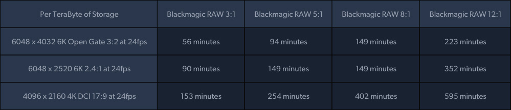 Blackmagic Cinema Camera uses high speed CFexpress Type B cards which are much faster than even the fastest SD/UHS-II or CFast 2.0 cards. The high read and write speeds of CFexpress means you can easily record HD, Ultra HD, 4K and even 6K. When working in Blackmagic RAW, you can record an hour of full cinematic quality footage in 6K on a single 512GB CFexpress card. You can even record to external SSDs using the USB‑C expansion port, making it possible to extend those recording times further.