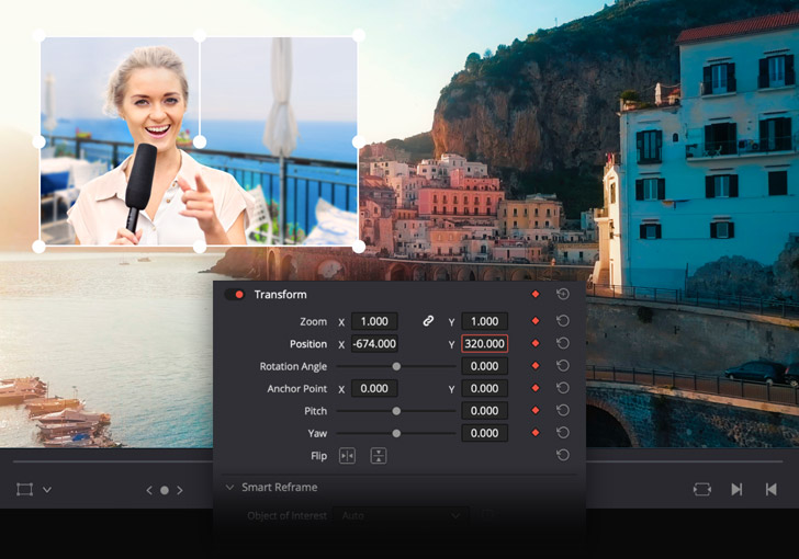 Dynamic zoom is an incredibly easy and fast way to reframe and add gentle push in or pull out animations to any shot. Dynamic zoom is ideal for adding extra drama and interest to shots which would otherwise be just static. Best of all, you don’t have to know anything about animation to use it! Just select a clip in the timeline, then turn on dynamic zoom in the inspector. When you have selected the clip, green and red boxes will appear in the viewer over your image. The green box shows where the shot will be framed at the beginning of the clip and the red box shows where it will be framed at the end. Simply drag and resize the boxes to your desired start and end positions, then press play!