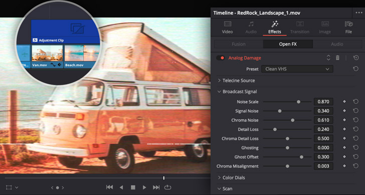 Adjustment clips make it easy to add an effect or color correction over multiple clips in the timeline. They work from the top down, so any effect you add to an adjustment clip will be applied to all the clips below it. For example, if you want to add the same analog film look to a series of clips in the timeline, drag a new adjustment clip from the effects library and place it on a higher video track over your clips. Trim it to the desired length, add the analog damage effect and adjust its settings in the inspector. All of the shots under the adjustment clip will have the same effect! You can even custom name adjustment clips and drag them back into a bin in the media pool for use later!