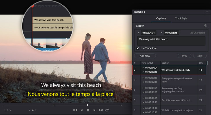 The edit page includes an intuitive set of tools for closed captioning and subtitles including support for importing timed text TTML, SRT, XML and embedded MXF/IMF subtitles. You can relink subtitle entries in the media pool or create them from scratch, without the need for expensive third party software. Subtitles appear in the timeline above of your video tracks and can be moved and trimmed like any other media. You can switch between subtitle tracks for different languages and add multiple captions per track. In the inspector, adjust track styles, change font, color, size, position and more! Subtitles can be rendered into the final video or exported as separate TTMLs, SRT or VTT files.