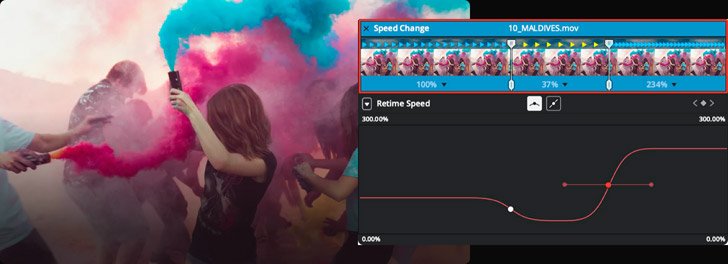 The retime control command lets you create fast or slow motion footage from any clip. Variable speed changes, or speed ramps, allow the playback speed to change over time. For example, an action clip may start at normal speed, ramp down to slow motion for a few seconds, and then speed back up. You can create speed ramps in the timeline using the graphical curve editor for both frame position and playback speed. Simply move frames to any point in time and adjust the speed between them! Control the quality of retimed footage by choosing between optical flow, frame blending and nearest frame rendering. DaVinci Resolve Studio has advanced speed warp for incredibly fluid, crystal clear quality!