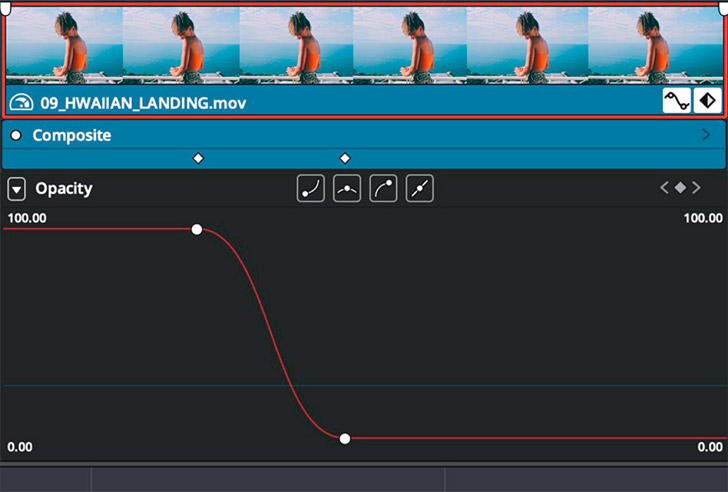 Animation doesn’t just refer to moving objects! Any setting can be changed over time. For example, you can animate the opacity of a clip from 100% to 0 over the course of a few seconds. When you do this in the inspector, the rate of change is constant, or linear. The curve editor lets you see keyframe positions and animation curves directly under each clip in the timeline. Simply click on the curve icon at the bottom right corner of the clip to open the curve editor. Using the drop down list on the left side, select the parameter you want and use the bezier tools to create your own custom ease in and out curve. Keyframes can be copied, pasted, moved in groups and edited as needed.