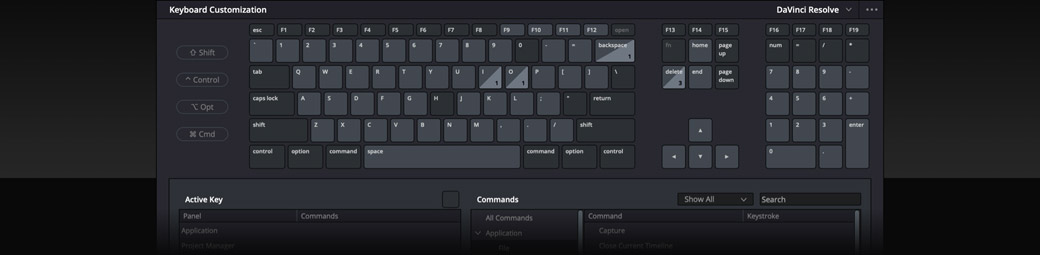DaVinci Resolve lets you customize and save your own keyboard shortcuts. There are even built in presets for other application shortcuts, which makes it easier if you're switching to DaVinci Resolve from other editing software! Virtually every command and tool, including context sensitive menu items, can be assigned a keyboard shortcut. Simply select keyboard customization from the DaVinci Resolve menu at the top left of the screen. The visual interface lists all available commands and currently assigned shortcuts. Press on any key to see what is in use and what else is available. Once you're done, you can save your own preset and even export it for use on other DaVinci Resolve systems!