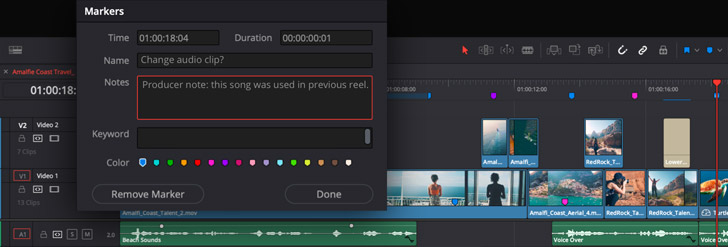 Markers are small indicators on a clip or timeline that can act as reminders about things you need to work on, shots that you like and more. Markers can be color coded, have a title, text description and keywords, and they can be set to any duration you'd like. Annotations are on screen notes or images used to leave comments or feedback on clips. You can enable annotations in the pop up menu at the bottom left of the timeline viewer. There are tools for highlighting, drawing and even typing or adding basic shapes. Markers and annotations help to keep you organized when working on larger projects and when collaborating with others. Annotations can even be shared with remote collaborators.