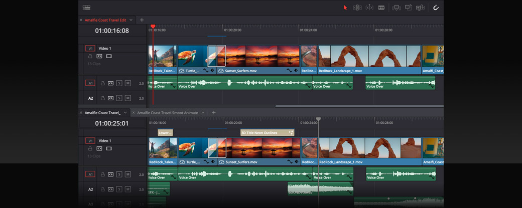 The fastest way to edit clips and scenes between timelines is to use the stacked and tabbed timeline features. Simply click the timeline view options icon at the top left of the timeline window to activate tabs. Timelines can be stacked vertically so you can drag and drop clips between them, or tabbed across the top of the timeline window so you can quickly switch to a new scene, copy the clips you need, switch to another timeline and paste them in! This lets you have multiple timelines open at the same time, which is essential when you’re working in larger, more complex projects or when you’re working with assistant editors and other collaborators in the color, Fusion or Fairlight pages.