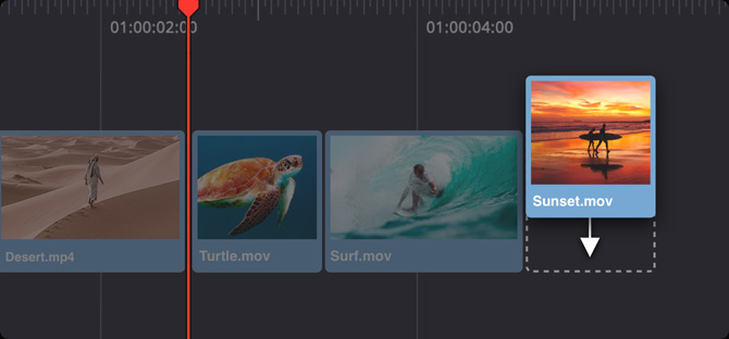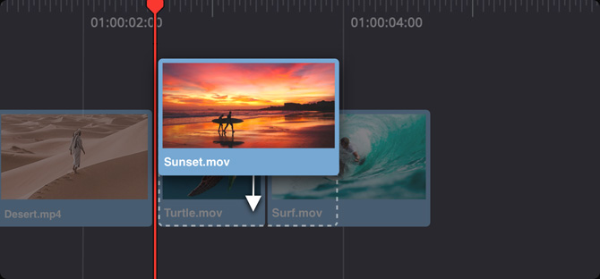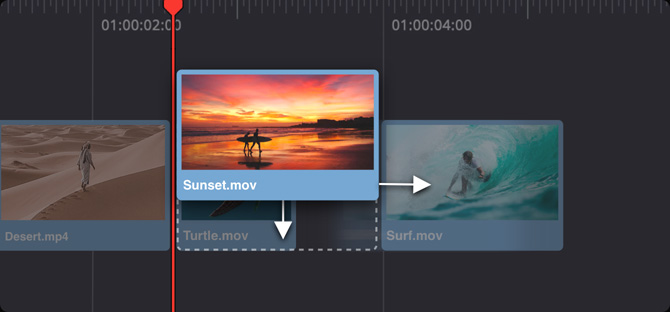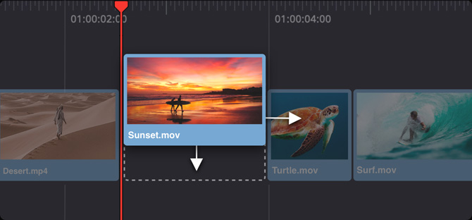 You can drag and drop clips directly into the timeline or the timeline viewer on the right, where you will see an overlay with editing options. The edit overlay gives you instant access to the most popular types of edits, letting you quickly choose between insert, overwrite, replace, fit to fill, place on top, append at end, and ripple overwrite without having to remember shortcut commands. Once you’re familiar with the different types of edits, you can use the buttons for the most common edit types on the toolbar or use keyboard shortcuts to work even faster. After you’ve placed a few clips on the timeline, you can rearrange them using the swap and shuffle commands.