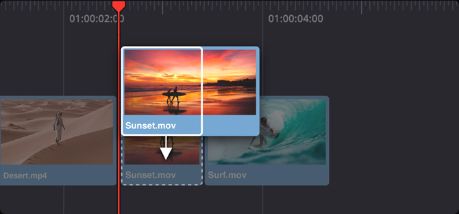 The overwrite edit is one of the most common types of edits. When you perform an overwrite, it will place a new clip on the timeline at the location of the playhead, writing over whatever clip or clips were there before.