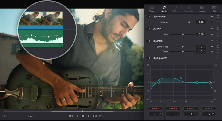 The edit page features a complete set of professional Fairlight audio controls and plug-ins. You can set levels of an audio clip in the timeline by clicking on the level bar in the middle of the clip. The inspector features a level slider too, along with controls for panning, pitch and a full 4 band parametric equalizer. To change the level on an entire track, simply adjust the track’s fader in the mixer. The mixer has visual meters that let you monitor signal levels, ensuring the audio is not too quiet or loud. There are also over 25 Fairlight FX in the effects library that you can use to clean up dialog, remove hum and more. Plus you can switch to the Fairlight page at any time for even more options!