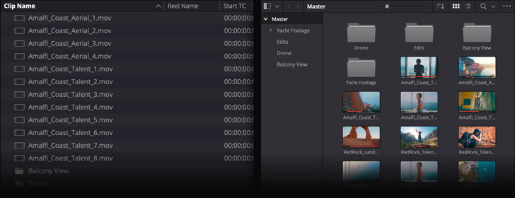 When you add clips into the media pool, you can create folders called "bins" to organize them. Select "New Bin" from the file menu and then simply drag the clips you want into the bin. Making bins is as easy as creating folders on your hard drive! The media pool has buttons to switch between icon and list view, along with a search tool for finding media, and a sidebar that displays the master bin hierarchy. You can also create smart bins that automatically sort footage based on metadata such as camera, date, scene and more. DaVinci Resolve Studio even features advanced facial recognition technology powered by the DaVinci Neural Engine to automatically create bins for individual characters!