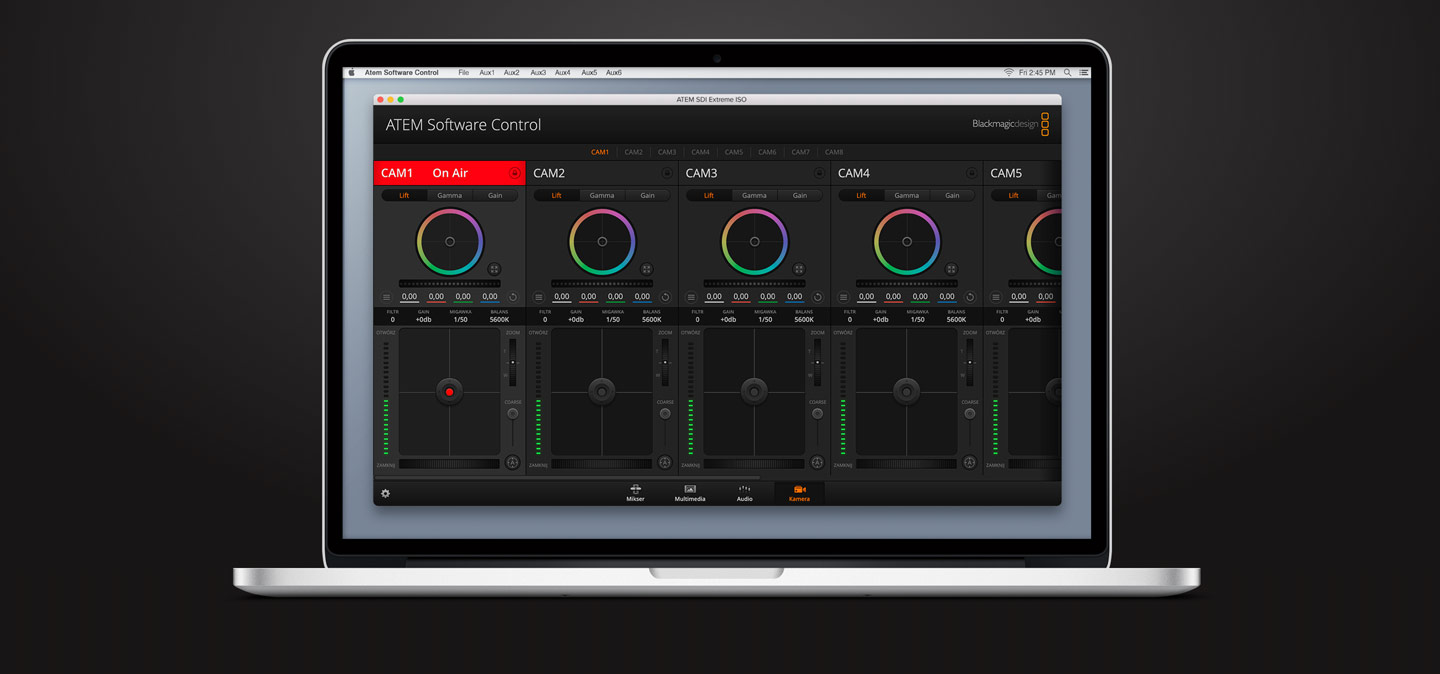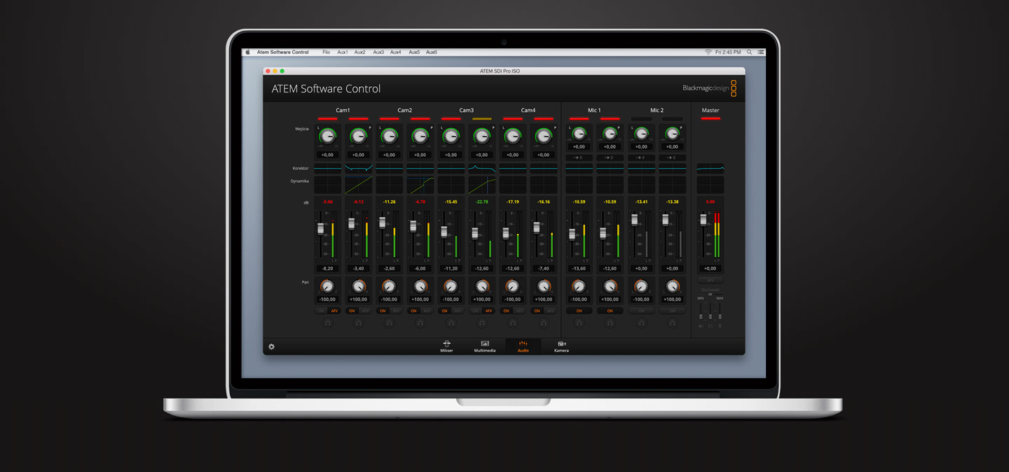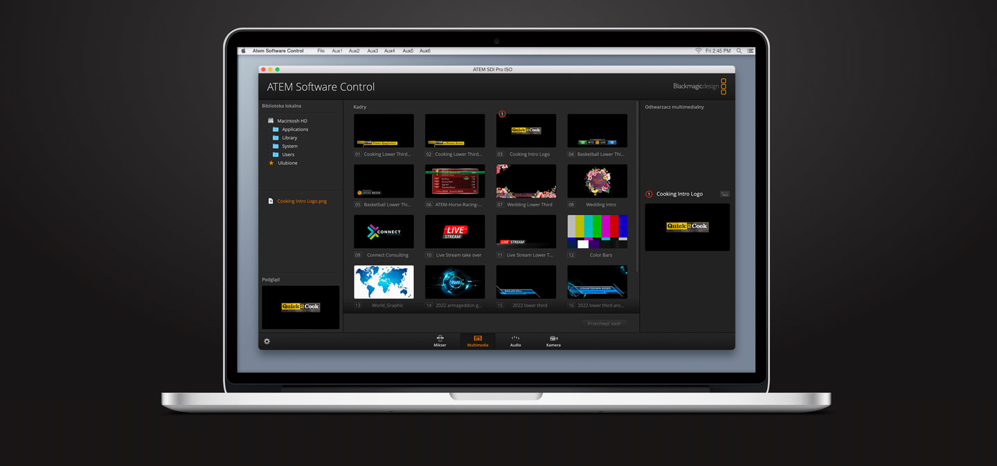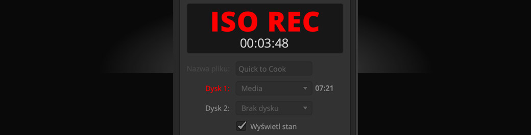 Modele ATEM SDI Pro i Extreme umożliwiają bezpośrednie nagrywanie danych strumieniowych na dyski flash USB. Otrzymujesz bardzo długie nagrania w tych samych plikach wideo H.264 z dźwiękiem AAC, które nadawałeś. To pozwala bezpośrednio przesłać je na dowolną internetową platformę wideo, taką jak YouTube czy Vimeo. Nagrywanie na kilka dysków jest też możliwe przez hub USB. Kiedy dysk jest pełny, nagrywanie jest kontynuowane na drugim dysku, by odbywało się nieprzerwanie. Ustawienia nagrania i wybór dysku są konfigurowane w ATEM Software Control, a w multiview można wyświetlić status nagrywania.