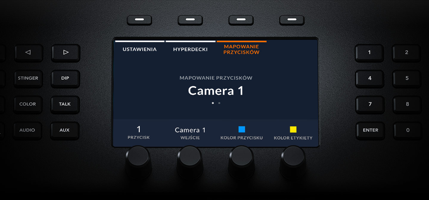Otrzymujesz pełną kontrolę nad wszystkimi ustawieniami miksera bezpośrednio z panelu, a dodatkowo sterowanie systemem automatycznie wybiera funkcje potrzebne do pracy z różnymi elementami miksera. Duży wyświetlacz LCD do menu ustawień z ekranowymi przyciskami i pokrętłami sterującymi pomaga szybko ustawiać zmiany. Menu są łatwe w nawigacji i uporządkowane według określonych funkcji. Możesz dostosować standardy wideo miksera, ustawienia wyjścia wideo, układ multiview, a nawet przedefiniować przyciski panelu!