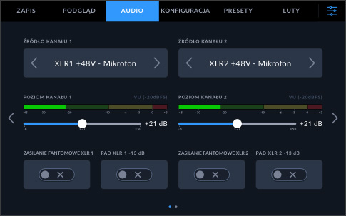Blackmagic Studio Camera ma niesamowity dźwięk z wieloma opcjami ustawiania i monitorowania wejść. Poziomy można szybko regulować, dotykając mierników dźwięku na wyświetlaczu przeziernym. Dla pełnej kontroli należy użyć zakładki Audio w menu ekranowym. Źródło dźwięku z wewnętrznych mikrofonów kamery można zmienić na wejście mikrofonowe 3,5 mm lub wysokiej jakości zbalansowane wejścia audio XLR. Zakładka ta umożliwia regulację poziomu głośności słuchawek i głośników, wzmocnienia mikrofonu i filtra dolnoprzepustowego. Włącz zasilanie fantomowe 48 V na złączach audio XLR, by używać mikrofonów bez własnego zasilania lub ustaw wejście jednokanałowe podczas korzystania z monofonicznych źródeł dźwięku.