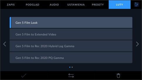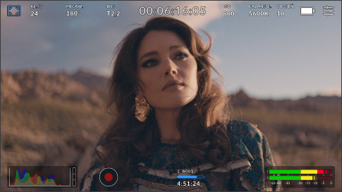 URSA Cine pozwala aktywować różne narzędzia do monitorowania za pomocą kilku gestów. Stuknięcie ikony monitora wyświetla nakładkę do przeglądania i regulacji ustawień. Możesz dostosować ustawienia zebry dla sprawdzenia ekspozycji dla podświetleń lub średniego poziomu szarości, wspomaganie ostrości, linie kadru, siatki i nie tylko.