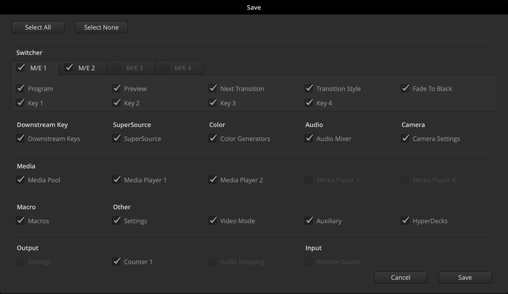 ATEM Constellation lets you quickly save your switcher set up at any time which means you can recall it instantly! The switcher state is saved as an XML file so you can even edit the files to make changes. If you're transitioning to ATEM Constellation from another ATEM switcher, then you can use the XML setups from any other model of ATEM switcher, even an ATEM Mini XML setup file! It all just works! You can save the switcher state any time you like, or you can setup ATEM Software Control to auto save at regular intervals and the older versions of the files are kept. When saving the switcher state, you save not only the settings, but all of the media pool contents as well!