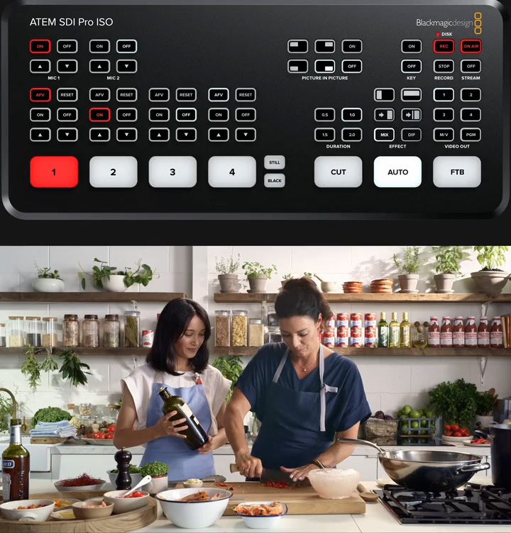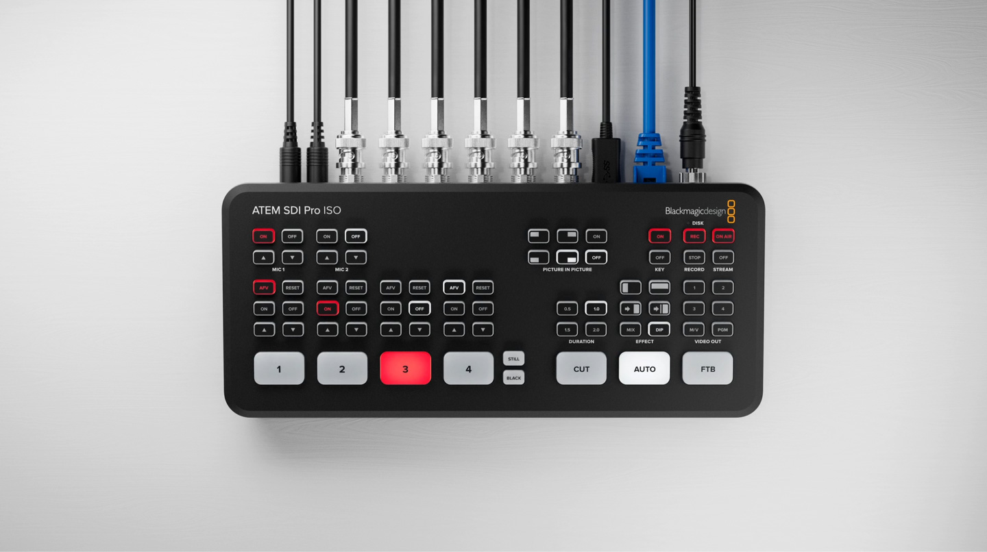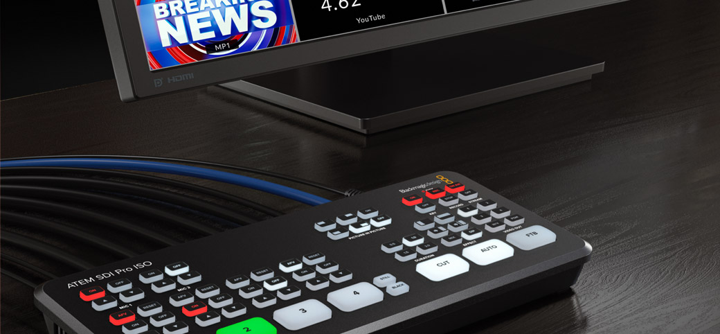 ATEM SDI is fast to set up and easy to use. It includes 4 standards converted SDI inputs, USB webcam, 2 SDI outputs, Fairlight audio mixer with EQ and dynamics, DVE for picture in picture, transition effects, green screen chroma key, 20 stills media pool for titles and free ATEM Software Control.