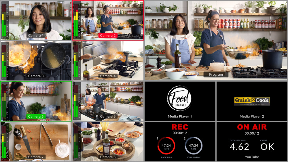 When doing larger live productions with multiple cameras, it’s very useful to see all your video sources at the same time on a single monitor. The ATEM SDI Pro and ATEM SDI Extreme models include a professional multiview that lets you see all video inputs, preview and program on a single SDI monitor! Simply select M/V button on the front panel to select the multiview! Each camera view includes tally indicators so you know when each source is on-air, and each view also has custom labels and audio meters. Plus the ATEM SDI Extreme models allow you to select up to 16 custom views! Multiview even includes status for recording, streaming and the audio mixer!