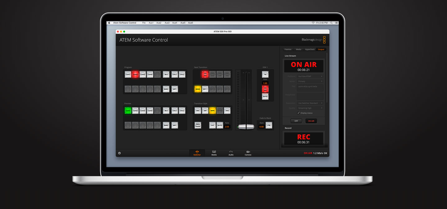 The ATEM SDI Pro and Extreme models also support direct recording of your streaming data to USB flash disks! That means you get very long recordings in the same H.264 video files with AAC audio that you streamed, so you can direct upload to any online video site, such as YouTube or Vimeo. Recording to multiple disks is also supported via a USB hub so when a disk fills, recording can continue to a second disk so you get non-stop recording. Record settings and disk selection are set up in ATEM Software Control and you can also display the recording status in the multiview.