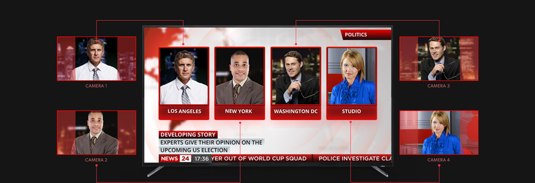 For news or on-set presentation work, ATEM SDI is perfect as it features the powerful ATEM Advanced Chroma Key for green screen keying effects. The chroma keyer is incredibly powerful and features a color picker to sample background colors for automatic generation of the key parameters. You get precise controls for edge and flare, and there is even a foreground color corrector so you can match the foreground and background layers for seamless compositions. You can even use it for title overlays by creating graphics with a green or blue background. Plus the ATEM SDI Extreme includes a massive 4 separate ATEM Advanced Chroma Keyers, for a keyer per camera, allowing virtual set production!