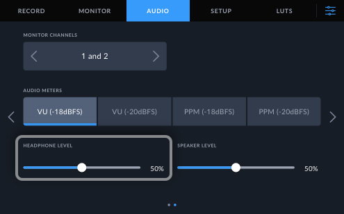 The bottom right corner of the LCD display has 4 audio channels that can be switched between VU and PPM ballistics. Tap on the meters to adjust levels using the pop-up audio dashboard. Then change the audio input and phantom power from the menus.