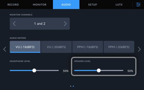 The speaker level adjustment controls the output volume of the small speaker integrated into the front panel for audio monitoring. To quickly access the speaker volume adjustment, simply tap the audio meters to open the audio dashboard.