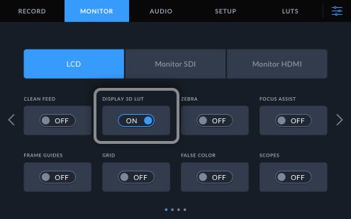This setting toggles the display LUTs on and off on the LCD or the monitor's SDI output. The toggle appears enabled when you have a 3D LUT selected in the LUT menu. Several example 3D LUTs are included in the LUT menu for you to choose from.