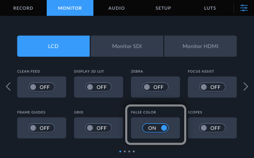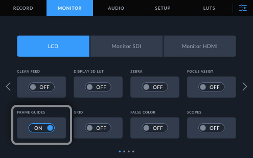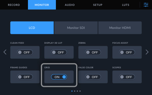 Tap on the monitor icon on the left to access the monitor overlay settings. These settings let you select and modify the appearance of overlay options, including zebra, focus peaking, guides, grid, false color, contrast, brightness and saturation.