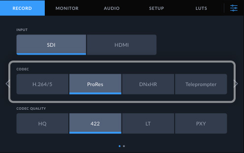 The codec menu lets you select ProRes, DNxHR or H.264 codecs for recording the HDMI input. It also serves as a playback mode selector. There is also a teleprompter option for displaying .rtf and .txt files on the HDMI output as scrolling text.