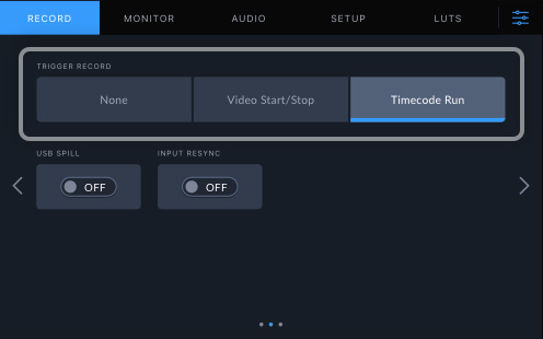 The trigger record menu allows the recording to start based on the video input. This menu allows HyperDeck to watch the video input. When it gets a start/stop flag, it starts recording, or you can even record when the timecode starts counting!