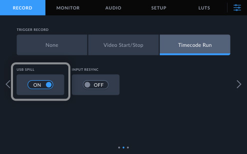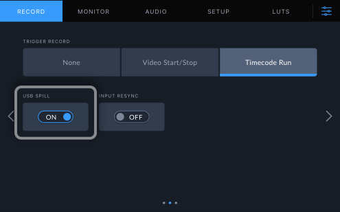 You can continue recording to a USB disk when the primary storage is full. By default, the recording will stop if an SD card becomes full during recording. With USB spill turned on, recording will continue to a USB disk when the card is full.