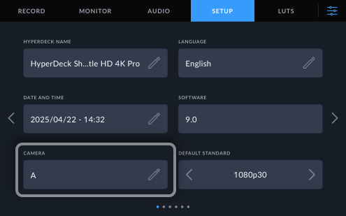 The camera number allows you to select a camera number for the metadata camera# tag in the recorded files. Entered as a letter, this allows software to detect between cameras such as when using the Sync Bin in DaVinci Resolve for multi-cam editing.