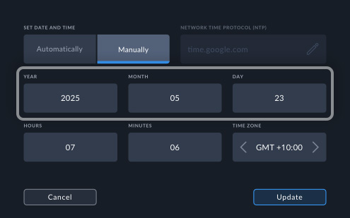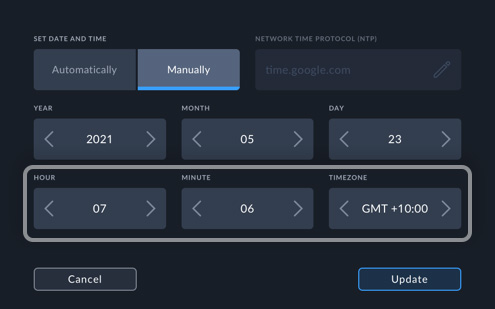 You can select to update the HyperDeck internal real-time clock manually or from a time server. There's a default time server set on your HyperDeck and if it's connected to the internet, it'll automatically keep the time perfectly synchronized.